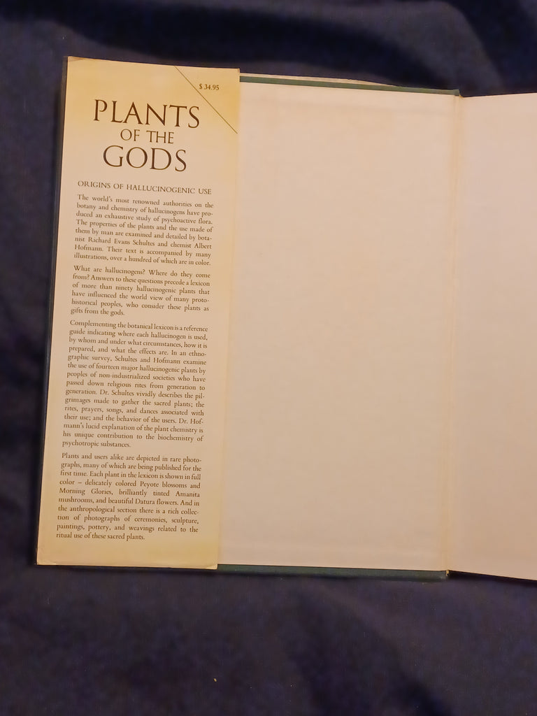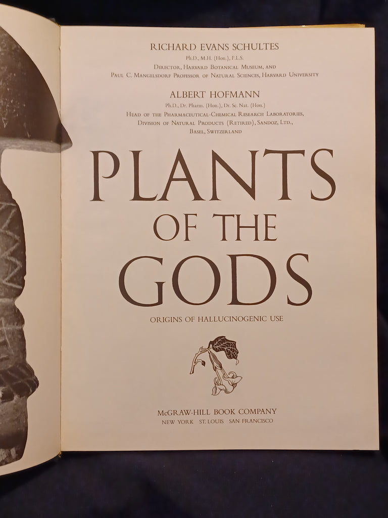 Plants of the Gods: Origins of Hallucinogenic Use by by Richard Evans Schultes and Albert Hofmann. McGraw-Hill Book Company. (1979). Assumed first printing with no listing of later printings. ISBN-10: ?0070560897. 8" by 10 1/2" 192 pages Hardcover with dust jacket. DUST JACKET: Moderate edge wear. Bumping to the top of the dj. 1/4" tears: the top of the front joint, bottom front of the spine, and bottom of the back panel nest to the joint of the flap. There sems to be some light tanning to the tops of the flaps, which are white, which can't be seen on the rest of the dust jacket because of its dark color. Otherwise, no unusual folds or creases. No clips. No missing pieces. Not price-clipped with dj price of $34.95. the dust jacket is not tight and new. BOOK: Bright gilt illustration on the front cover and bright gilt lettering on the spine. Maybe light cover edge wear. There are a few tiny specks of soiling of unknown origin on the covers. I found at least some are removable using finger nails. The tanning to the flaps of the dust jacket are also on the tops of the end papers and may be showing on the edges of the page block. Otherwise, no previous owner markings. No tears, folds or creases to pages. Binding is tight with no looseness to pages. Not ex-library, not remaindered and not a facsimile reprint. For sale by Jon Wobber, bookseller since 1978. KK13a