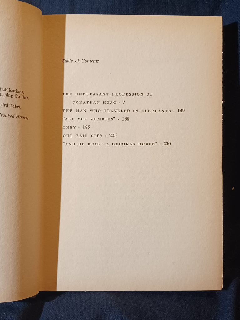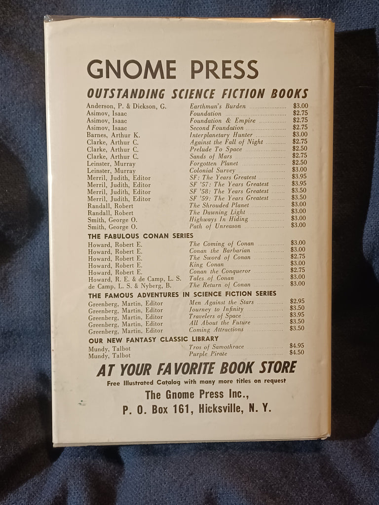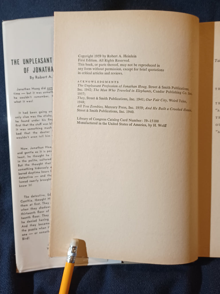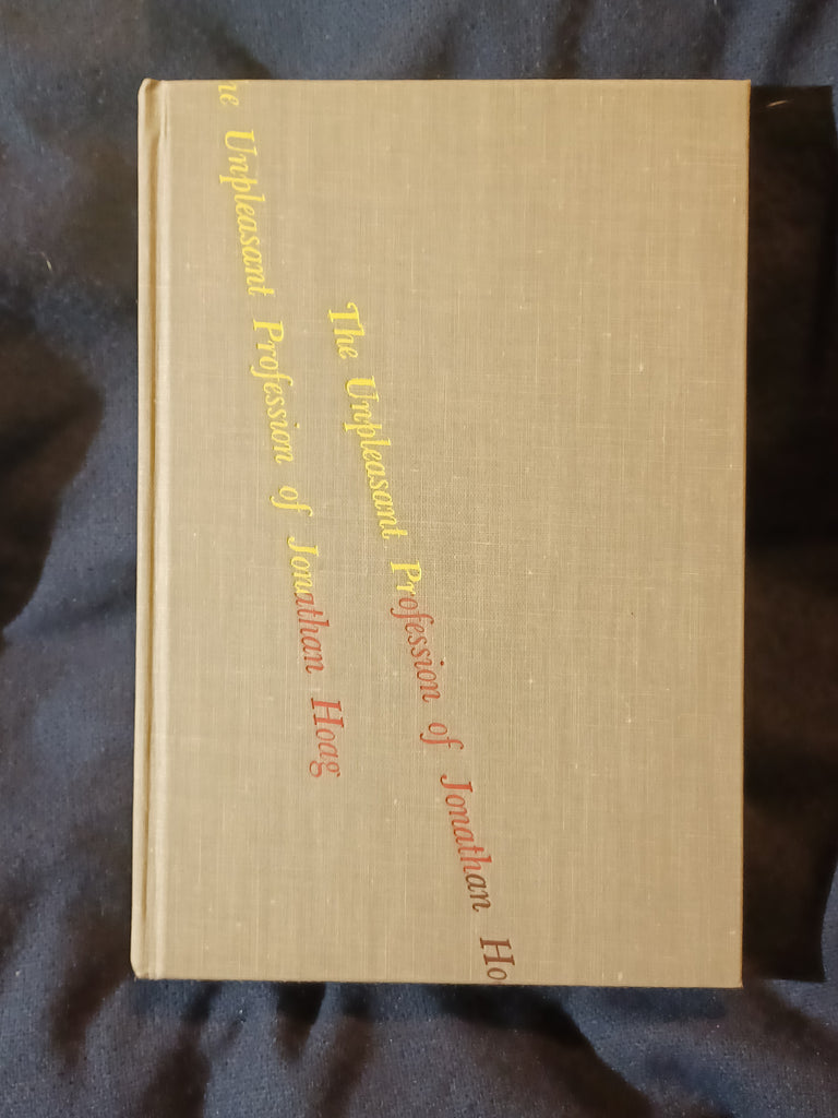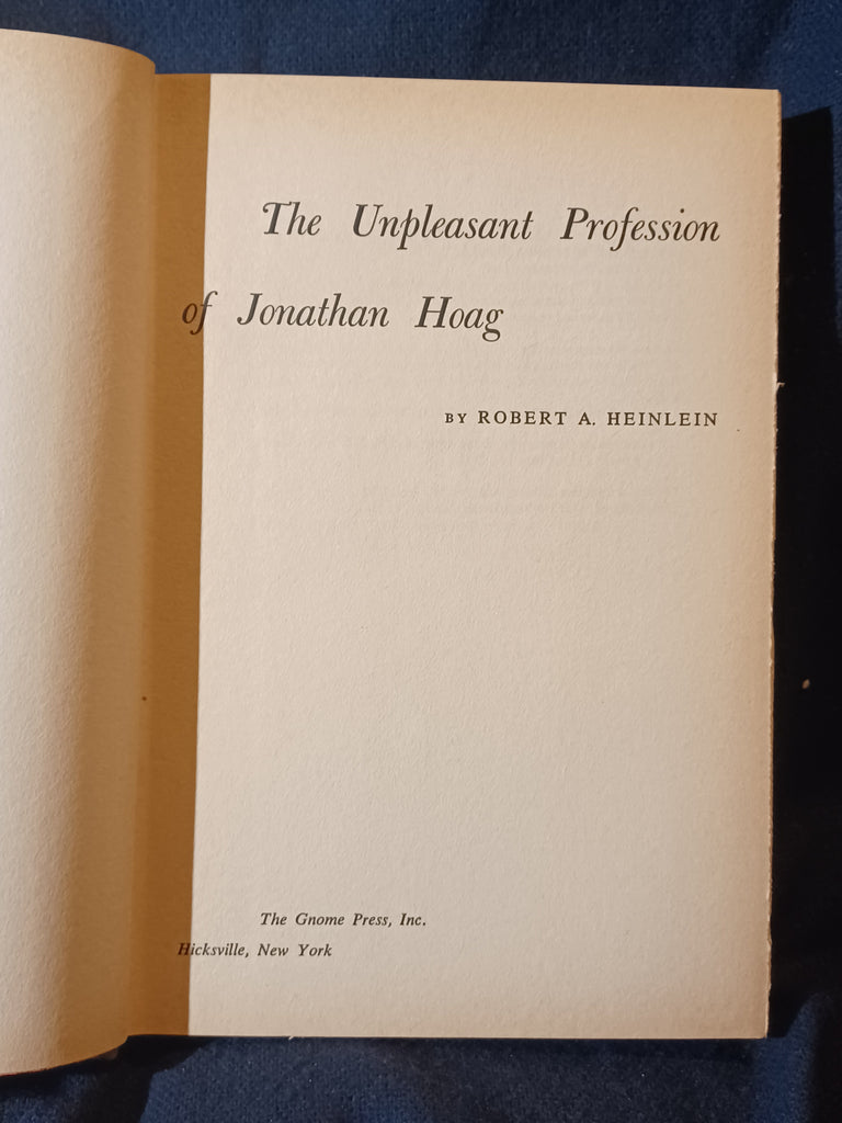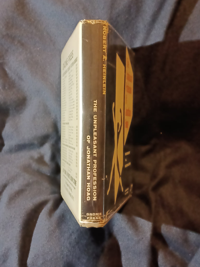 The Unpleasant Profession Of Jonathan Hoag by Robert A. Heinlein. Gnome Press. (1959). "First Edition" stated with no listing of later printings. 5 3/4" x 8 1/4" 256 pages Hardcover with dust jacket. DUST JACKET: Has wear and minor chipping to the top and bottom of the spine. Tears next to the spine and next to the joint, about 1/2" each, with  associated folds, on the bottom of the front panel. Some wear on the top of the back panel. Not price-clipped with dj price of $3.50.  Now protected by a removable mylar dj cover. BOOK: Light cover edge wear. Paper is tanned with no effect on page flexibility. No previous owner markings.  No tears, folds or creases to pages. Binding is tight with no looseness to pages. Not ex-library, not remaindered and not a facsimile reprint. For sale by Jon Wobber, bookseller since 1978. KK06a