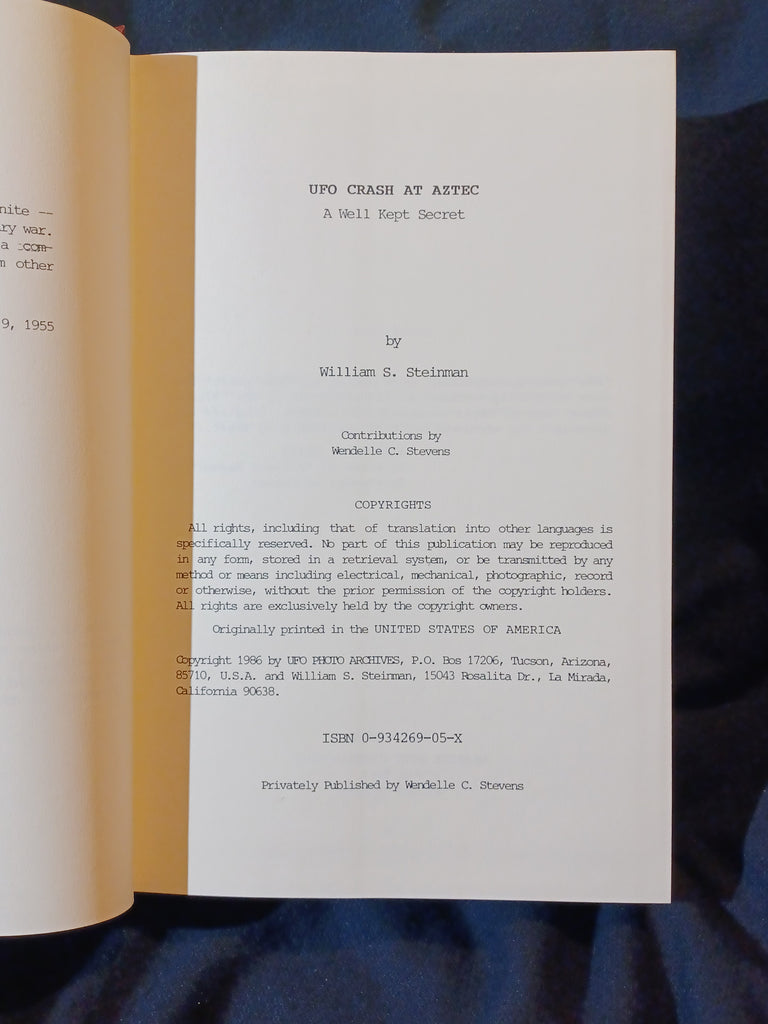 UFO Crash at Aztec: A Well Kept Secret by Wiliams S. Steinman and Wendelle C. Stevens. UFO Photo Archives. 1986. An unnumbered copy in a limited edition of 1000 copies. ISBN-10: 093426905X. 6 1/4" x 9 1/4" 625 page Hardcover with dust jacket. DUST JACKET: Light edge wear. Light bumping to dj corners. Some light surface abrasions and scratching - nothing breaking the surface ink. Otherwise, no unusual folds or creases. No tears. No clips. No missing pieces. Not price-clipped with dj price of $18.95. BOOK: Bright silver lettering and illustration on the front cover and spine. Light dust soiling on the top of the page block. Maybe light cover edge wear. Erasure marks on the first blank page. No other previous owner markings. No tears, folds or creases to pages. Binding is tight with no looseness to pages. Not ex-library, not remaindered and not a facsimile reprint. For sale by Jon Wobber, bookseller since 1978. KI28b