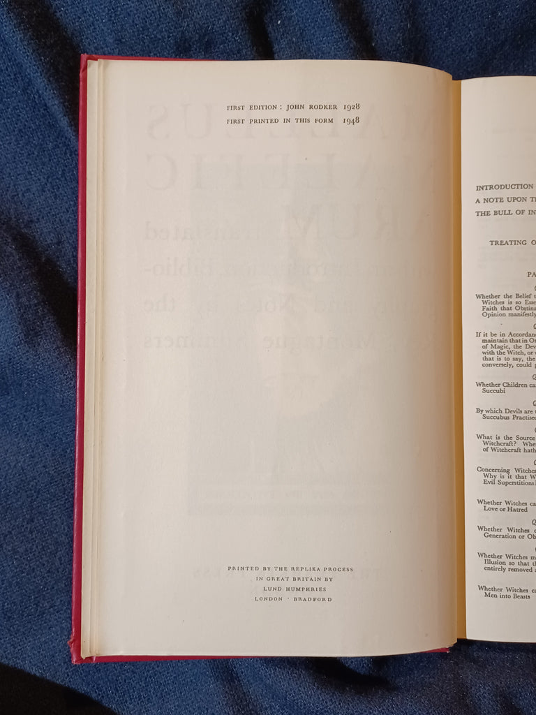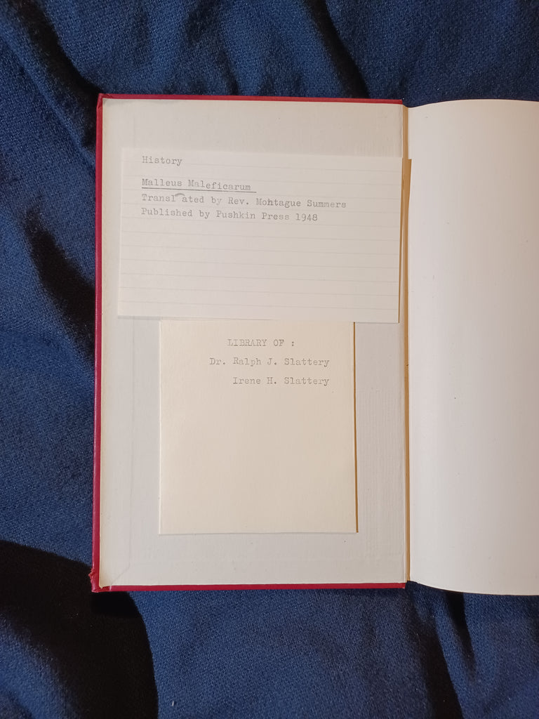 Malleus Maleficarum by Montague Summers. Pushkin Press. Printed by Replika Process Lund Humphries, London. 1948. 5 3/4" x 9" xxi, 278 pages Hardcover with no dust jacket. Bright gilt lettering on the front cover and spine. Light bumping on bottom of the spine and cover tips. Cloth has worn through on about 1/4" of the top back cover tip and the bottom of front cover tip. Otherwise wear is mostly light. There is some surface wear to the cover faces, but nothing approaching wearing though the surface. Inside the front cover is an envelope and check-out card from somebody's private library (not an institutional library). Check out card has only information about the book itself. It appears the previous owner never lent the book to anybody else. Pages may be lightly tanned with no effect on paper flexibility. I see no other previous owner markings. No tears, folds or creases to pages. Binding is tight with no looseness to pages. Not institutional ex-library, not remaindered and not a facsimile reprint. For sale by Jon Wobber, bookseller since 1978. LA17a