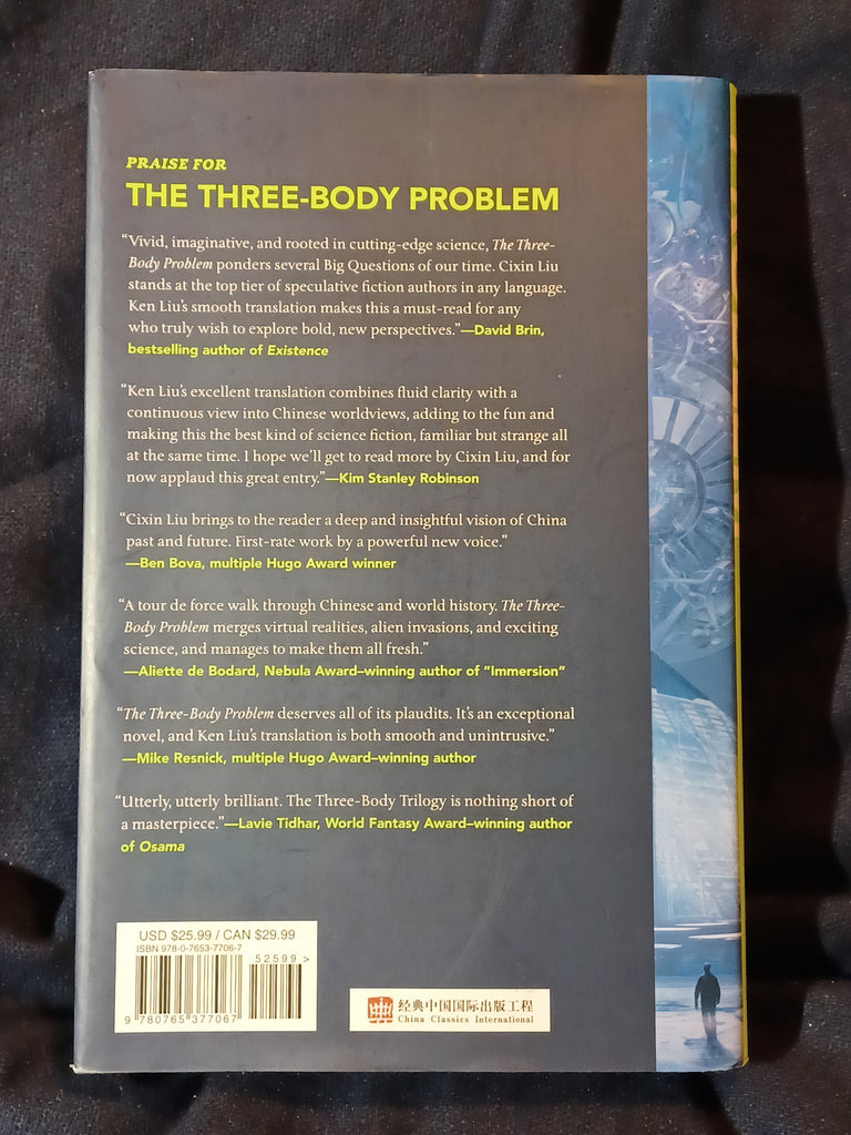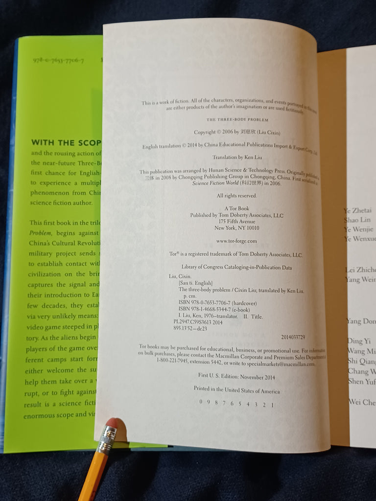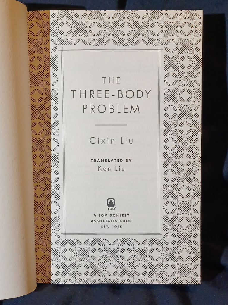 The Three-Body Problem by Cixin Liu. Translated by Ken Liu. Tor Books/ Tom Doherty Associates. (2014), "First U.S. Edition: November 2014" stated with complete number line from 1-10. ISBN 13: 978 0765377067. 6 1/4" x 9 1/2" 399 pages Hardcover with dust jacket. DUST JACKET: Light rubbing and bumping to the dust jacket edges. Otherwise, no unusual folds or creases. No tears. No clips. No missing pieces. Not price-clipped with dj price of $25.99. BOOK: Bright iridescent green lettering to the spine. Some bumping on the bottom of the spine. Slight bowing to the back cover. Otherwise, no previous owner markings. No tears, folds or creases to pages. Binding is tight with no looseness to pages. Not ex-library, not remaindered and not a facsimile reprint. For sale by Jon Wobber, bookseller since 1978. KL10a