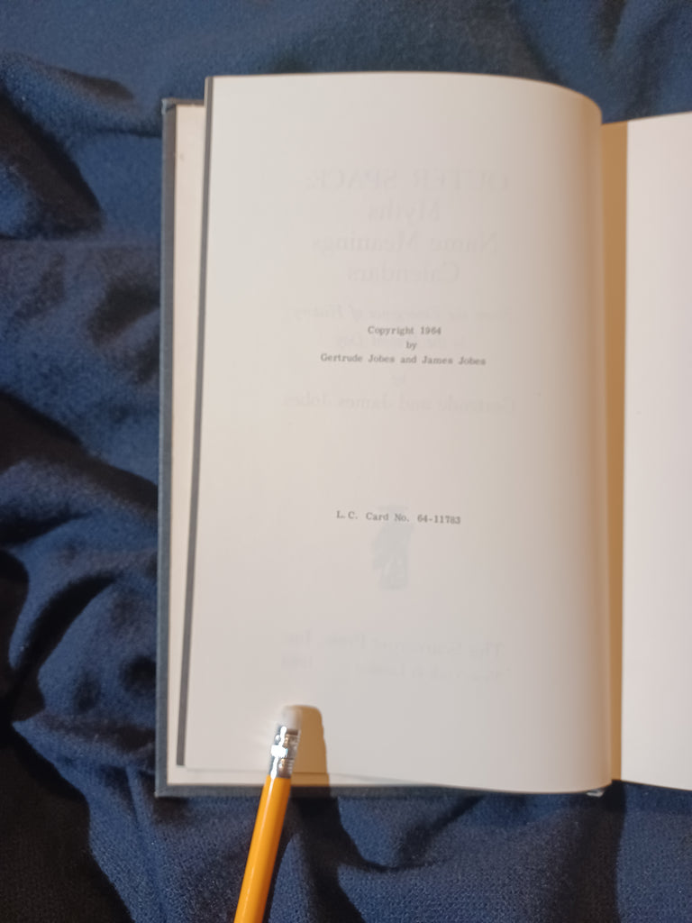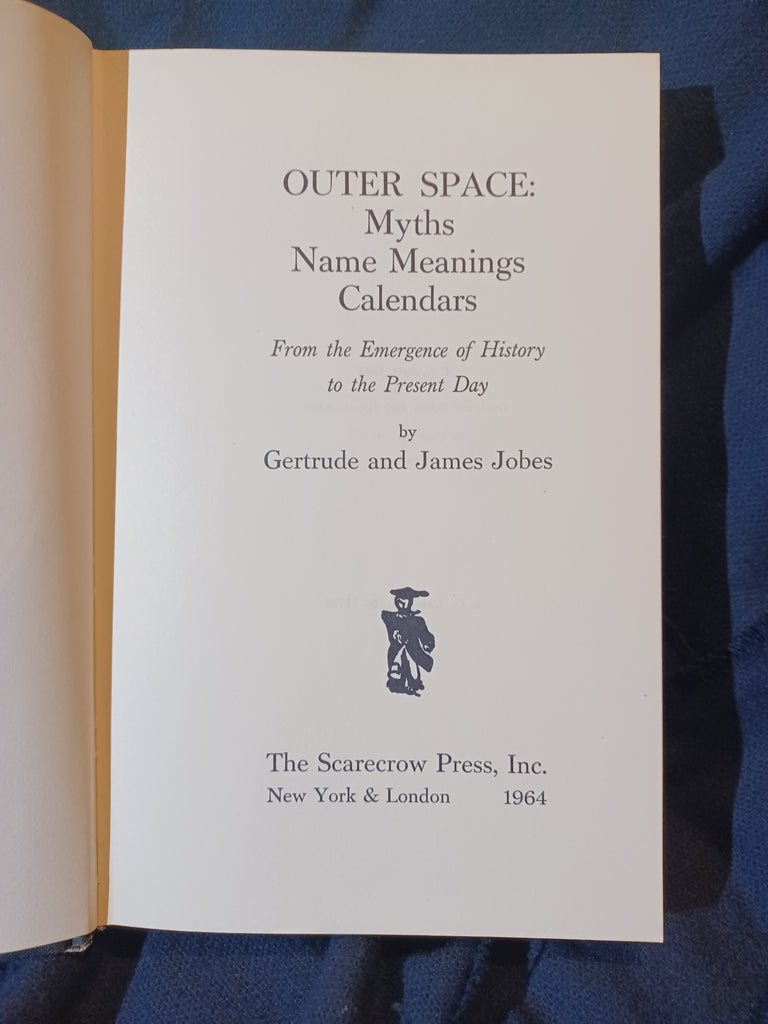 Outer space: Myths, name meanings, calendars by Gertrude and James Jobes. Scarecrow Press. 1964. 5 3/4" x 8 3/4" 479 pages Hardcover with no dust jacket. Bright white lettering and design on the spine. Moderate wear on the cover extremities. Erasure marks on the first blank page. No other previous owner markings. No tears, folds or creases to pages. Binding is tight with no looseness to pages. Not ex-library, not remaindered and not a facsimile reprint. For sale by Jon Wobber, bookseller since 1978. KI28a