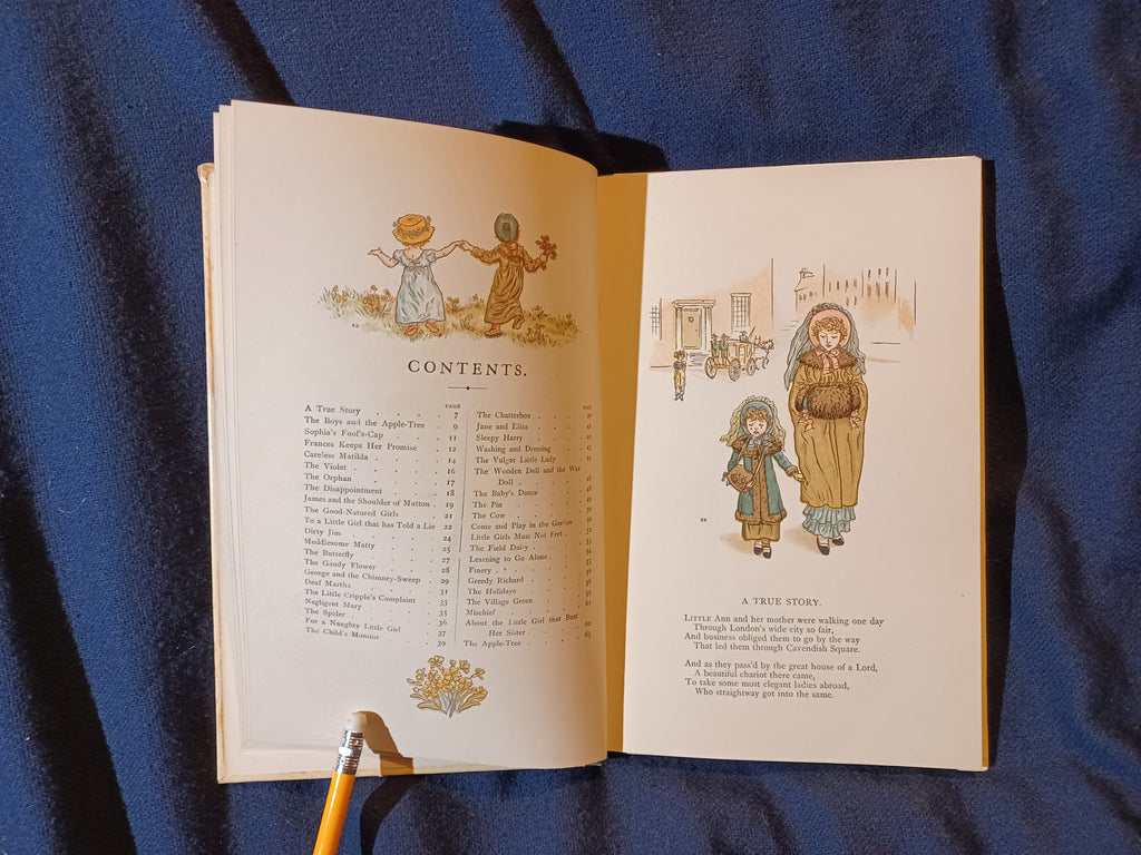 Little Ann: A Book by Kate Greenaway. Frederick Warne and Co. (no date). 5 3/4 x 8 3/4 64 pages Hardcover with no dust jacket. Moderate cover edgewear. Slight discoloration to the front cover. A little bit of water staining to the top of the back cover with some slight bleed over onto the top of the last page. A light abrasion to the back cover. Book was gifted in 1930 for Christmas by 'Mother'. but from the printing process, I believe this is a much older book. Printing process appears to be that which was more common from about !880 to 1900 and not a half-tone type print. Erasure marks on the last blank page inside the back cover. Very light tanning inside the front and back covers. No other previous owner markings. No tears, folds or creases to pages. Binding is tight with no looseness to pages. Not ex-library, not remaindered and not a facsimile reprint. For sale by Jon Wobber, bookseller since 1978. sKJ12a