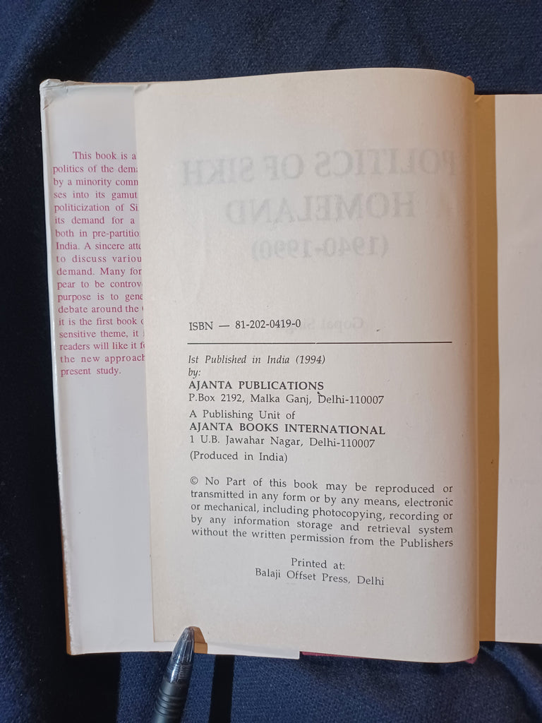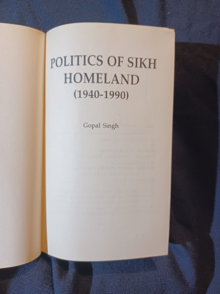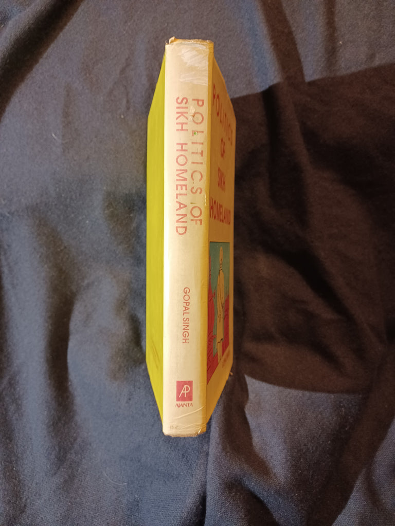 Politics of Sikh Homeland by Gopal Singh. Ajanta Publications. (1994). ISBN 10: 8120204190. 5 3/4" x 8 3/4" vi, 329 pages plus copyright and table of contents pages Hardcover with dust jacket. DUST JACKET: Heavy wear on the top of dj spine. Bumping and wear to the rest of the top dj edge. Less so on the bottom dj edge. Dj spine is sun-faded. Not price-clipped with dj price of Rs. 395. BOOK: Moderate cover edge wear. Pages very lightly tanned with effect on paper flexibility. A small gouge on the gutter inside the back cover. Previous owner or bookseller rubber stamp inside the back cover. No other previous owner markings. No tears, folds or creases to pages. Binding is tight with no looseness to pages. Not ex-library, not remaindered and not a facsimile reprint. For sale by Jon Wobber, bookseller since 1978. KJ23a