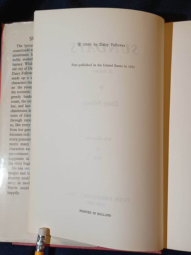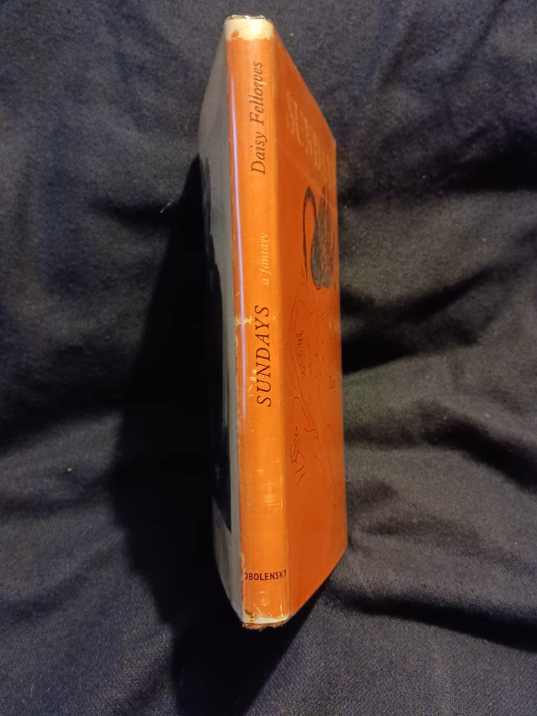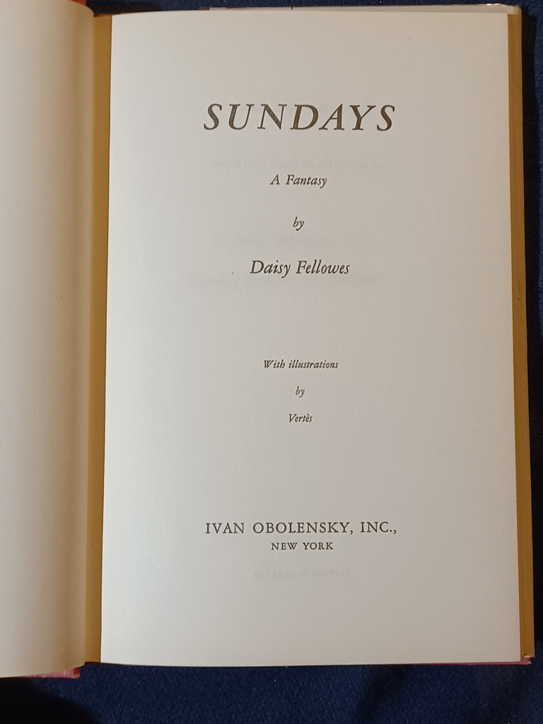 Sundays: A Fantasy by Daisy Fellowes with illustrations by Vertes. Ivan Obelensky Inc. "First published in the United States in 1961" stated with no listing of later printings. 5 1/2" x 8 1/4" 115 pages Hardcover with dust jacket. DUST JACKET: Chips on the top and bottom of the dj spine. Some other chips and tears on the top and bottom of the back panel. Otherwise, no unusual folds or creases. Also some surface abrasions. Soiling on the back panel. Not price-clipped with dj price of $3.75. Now protected by a removable mylar dj cover. BOOK: Moderate cover edge wear. A few light pinhead sized spots on the leading edge of the page block. Otherwise, no previous owner markings. No tears, folds or creases to pages. Binding is tight with no looseness to pages. Not ex-library, not remaindered and not a facsimile reprint. For sale by Jon Wobber, bookseller since 1978. KH31b