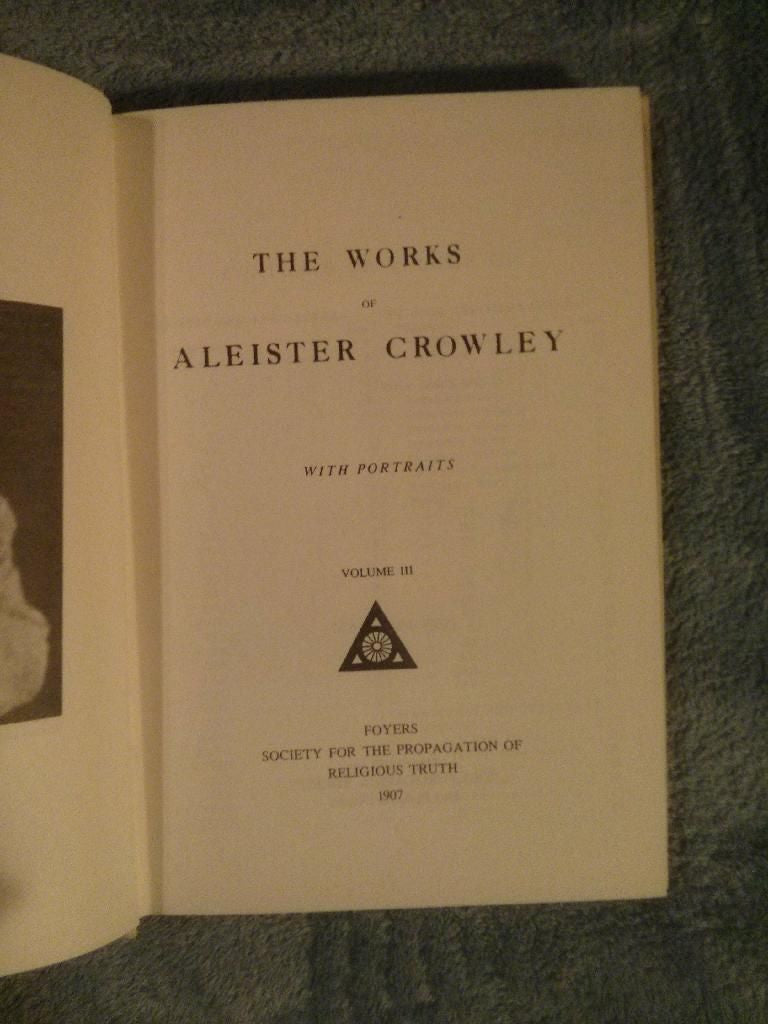 The Works of Aleister Crowley with Portraits -3 Vol. Set; Aleister Crowley; Yogi Publication Society (1905/1974); 1st Thus;/VG; Not Ex-Library, Not Book Club, Not Print on Demand; All Vols: Hb-White w/stamped gilt lettering + device, almost no edgewear, very minimal bumping, some scuffing; 799 total pgs- Frontice of each book is a black+white portrait taken at different times of his life beginning with a young Crowley in vol. 1, clean, binding tight.
