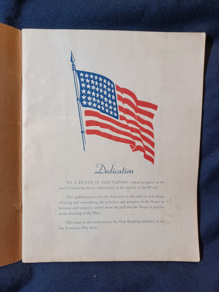 "The years from 1940 to 1944 have been the opening of many channels of employment for the Negro people. In this magazine - the first of its kind in Northern California - it is the plan of the Editor and Staff to depict the progress of A TENTH OF THE NATION - THE AMERICAN NERGRO!