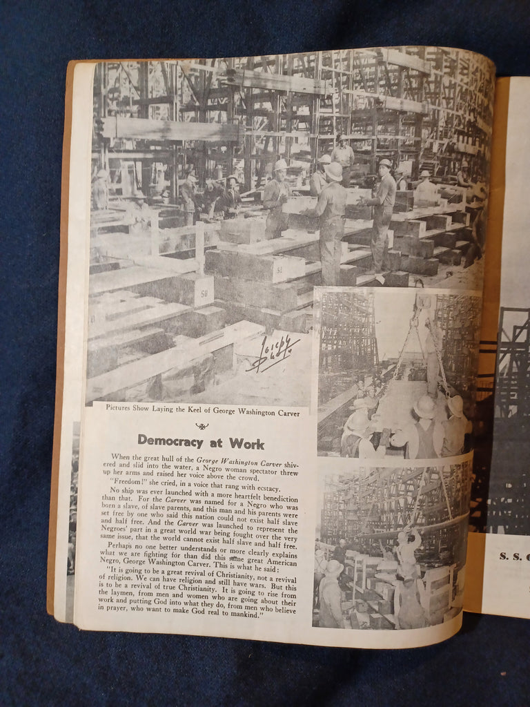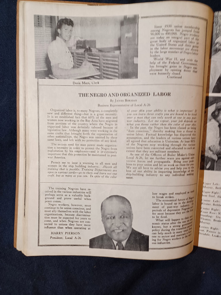 Prior to the second World War, there were very few Negroes working in many crafts and industries. Today, due to the increase in production needs and the shortage of man power, employers who, heretofore were reluctant to hire Negro labor have been compelled to employ Negroes. Their contributions to the war effort have much to destroy the myth that the Negro is lazy and incompetent, and has no place in the industrial life of the country except that of a common laborer and a "flunky." Although it is discouraging to be aware of the fact that it took a World War and dire necessity to show that Negroes could work as skilled craftsman, we are proud of the fact that Negroes throughout the Nation, have accepted the work that necessity and expediency have forced upon them, and have emerged with "colors flying" and the definite proof of their capabilities. There is still a long way to go before equality is attained, but the pace is faster and the results will be lasting. Today in the ship building industry alone, we are represented by Negro carpenters painters, shipwrights, ship fitters, electricians, riggers, welders, burners, drillers, chippers, cockers, stage riggers, engineers, co-ordinators, accountants, stenographers, clerks, etc." - from Ben Watkins, Editor